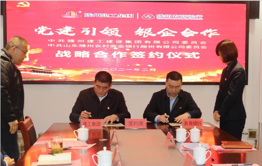 为深入贯彻落实习近平新时代中国特色社会主义思想,充分发挥企业和银行的双方优势,实现银企互利共赢,2月2日,集团与滕州农商银行在二楼会议室,举行“党建引领 银企合作”党建共建暨战略合作协议签约仪式。滕州农商银行党委书记、董事长刘志强,集团党委书记、董事长蔡成奎出席签约仪式并分别致辞。集团党委委员、副总经理侯钦海主持会议。滕州农商银行党委副书记、行长王豹,滕州农商银行党委副书记、监事长苏亚峰,集团党委副书记、总经理李开防,党委副书记、副总经理秦延勇,及滕州农商行、集团相关负责人参加活动。